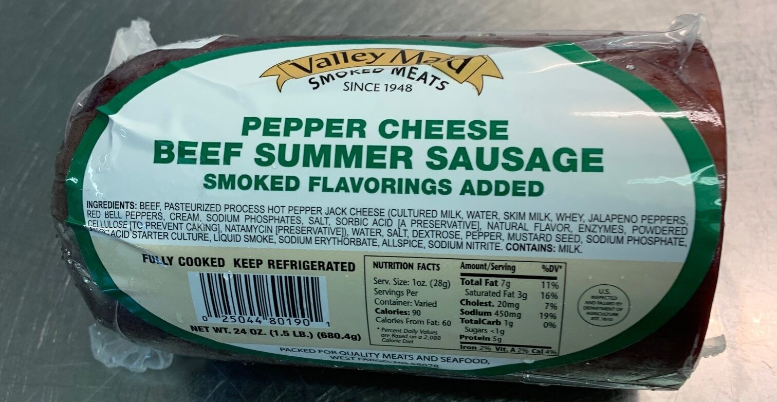 BEEF, PASTURIZED PROCESS HOT PEPPER CHEESE (CULTURED MILK, WATER, SKIM MILK, WHEY, JALAPENO PEPPERS, RED BELL PEPPERS, CREAM, SODIUM PHOSPHATES, SALT, SORBIC ACID [A PRESERVATIVE], NATURAL FLAVOR, ENZYMES, POWDWEWD CELLULOSE [TO PREVENT CAKING], NATAMYCIN [PRESERVATIVE], WATER, SALT, DEXTROSE, PEPPER, MUSTARD SEED, SODIUM PHOSPHATE, LACTIC ACID, STARTER CULTURE, LIQUID SMOKE, SODIUM ERYTHORBATE, ALLSPICE, SODIUM NITRITE. CONTAINS: MILK
